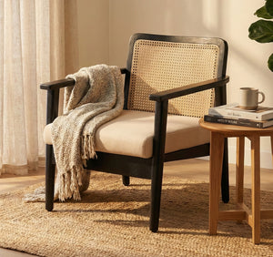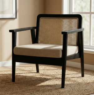 BEAUTIFUL DESIGN — Introducing the Atri occasional chair: a sturdy, well-designed piece that exudes sophistication. The expertly woven cane back creates an attractive and intricate pattern, while the black-painted mango wood adds elegance and blends perfectly with the cane's natural tones. The seat cushion is made with beautiful linen, and all materials are environmentally friendly, making this chair a sustainable choice. With its generous proportions and classic silhouette, the Atri chair brings a stylish and timeless quality to your home.