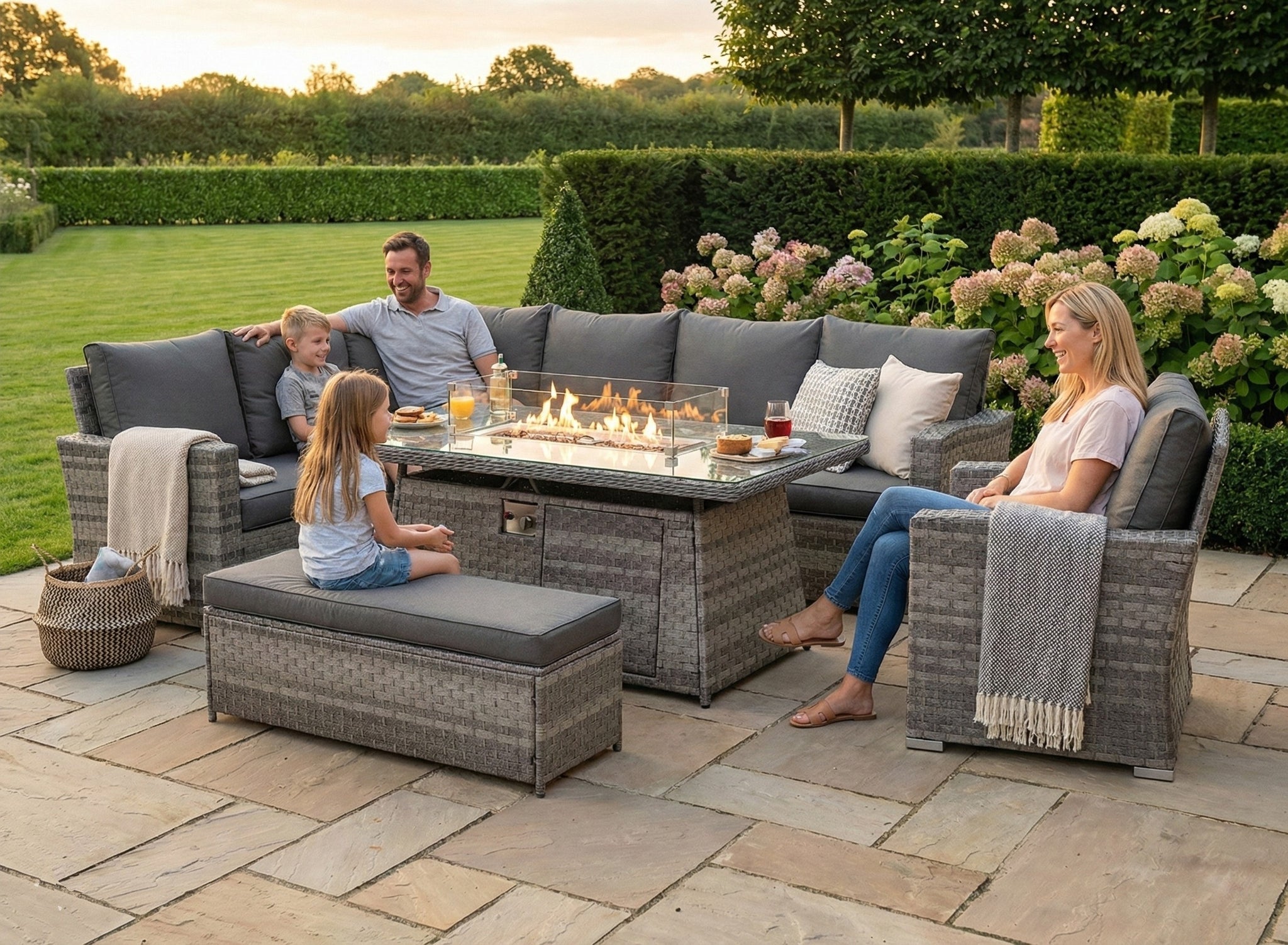 The table features an integrated gas-fuelled fire pit creating a versatile centre-piece.