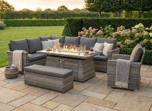 The set includes a rattan corner sofa with cushions, a bench, a chair and a firepit dining table. (Small scatters and throws on the lifestyle images are not included).