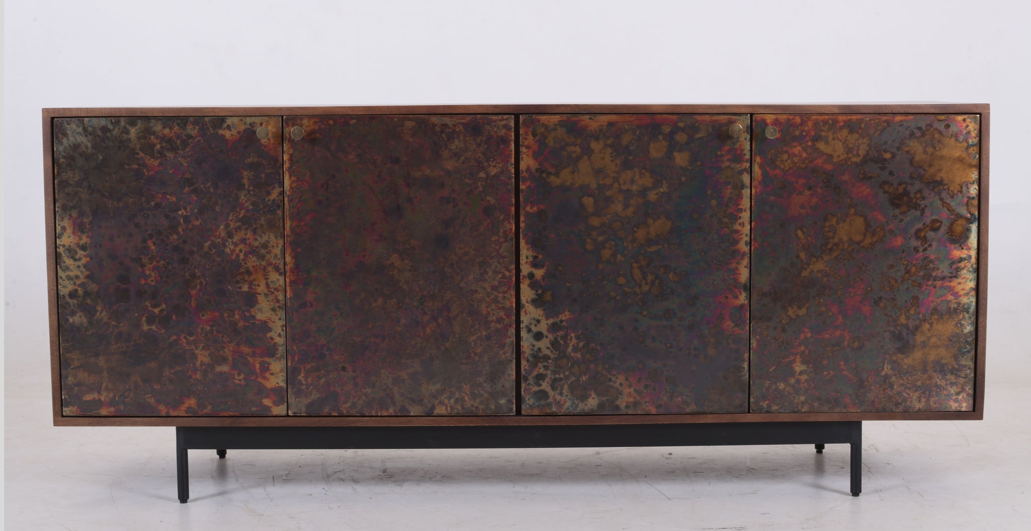 The cabinet frame is made from solid mango wood, prized for its durability, rich grain patterns and sustainable sourcing. Each door features a unique patina-finished metal façade, creating an artistic, almost molten texture with deep bronze, gold and oxidised tones. Every unit is individually finished, meaning no two pieces are ever the same.