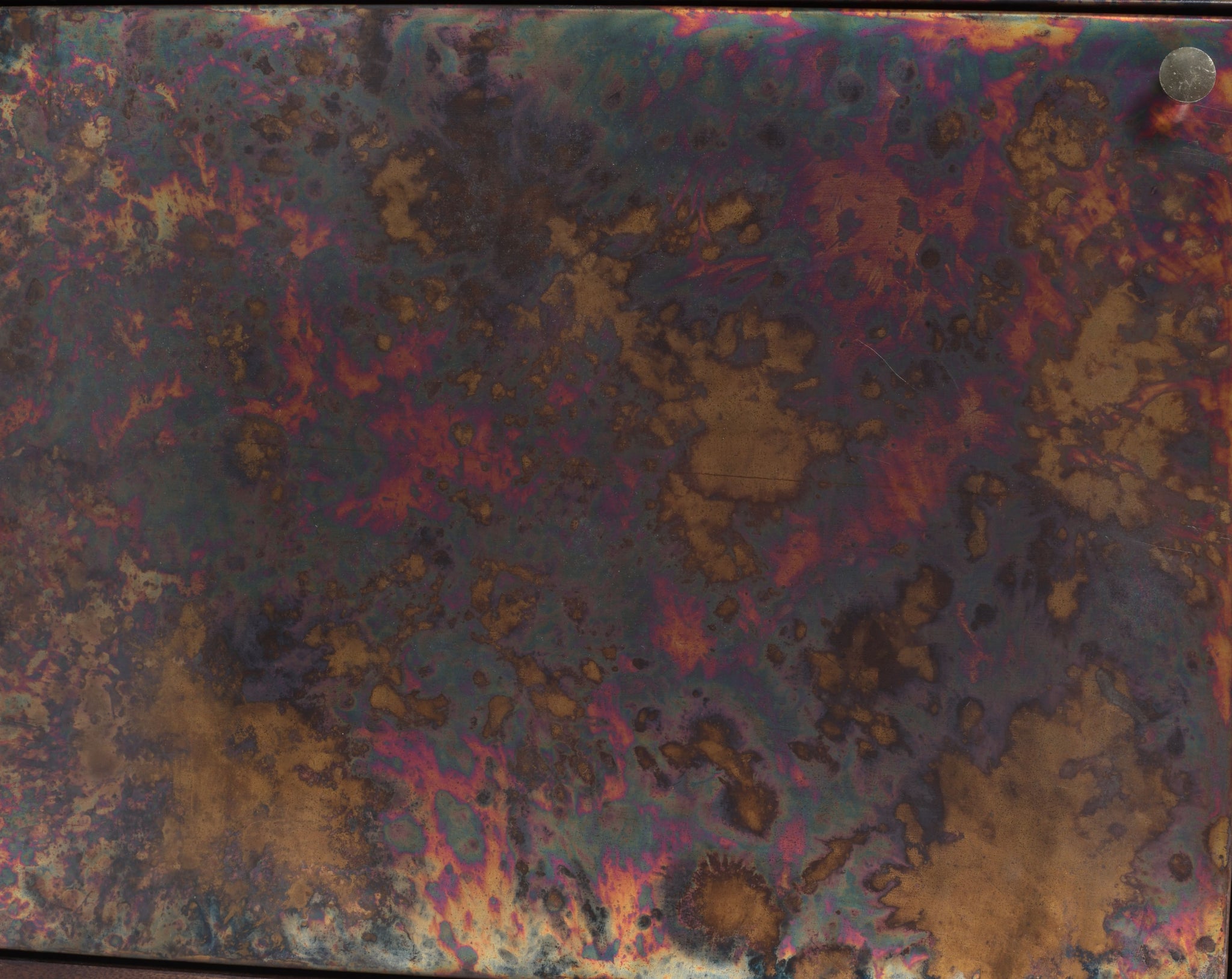 Patina-finished metal door panels, each with a unique pattern and colour variation