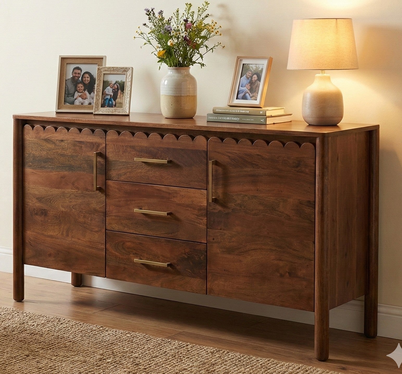Crafted from 100% solid mango wood, the Savoy Sideboard combines timeless craftsmanship with subtle contemporary detail. Its beautifully grained hardwood body is finished in a rich walnut tone, enhanced by elegant scalloped edging and sleek antique brass handles — giving it a look that’s both distinctive and refined.