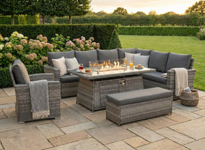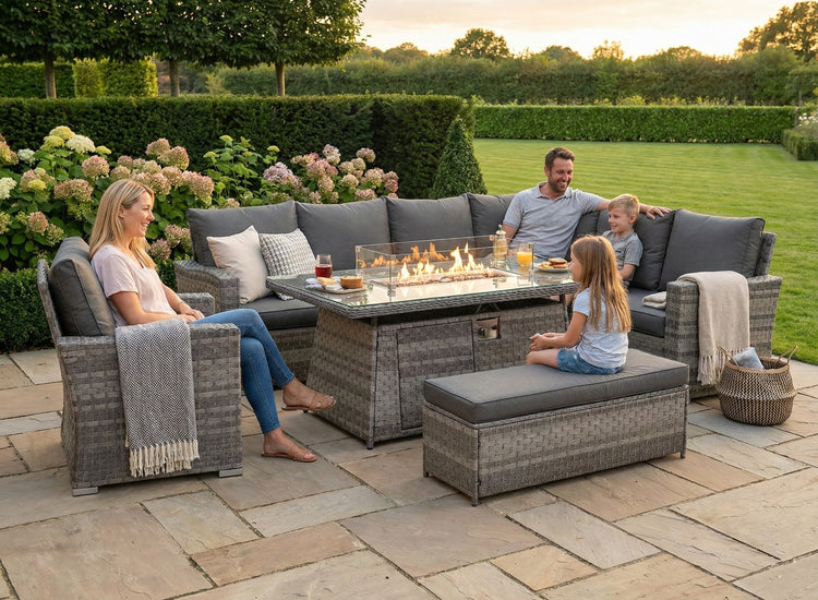 The set includes a rattan corner sofa with cushions, bench, chair and a firepit dining table. (Small scatters and throws on the lifestyle images are not included).