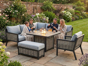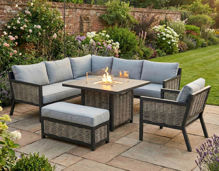 The contemporary style of our Porto range adds an instant wow factor to any outdoor space. Lightweight yet robust, the Anthracite aluminium frame features eye-catching, chunky rattan in soothing grey tones. The attractive ceramic tabletop features a modern firepit.