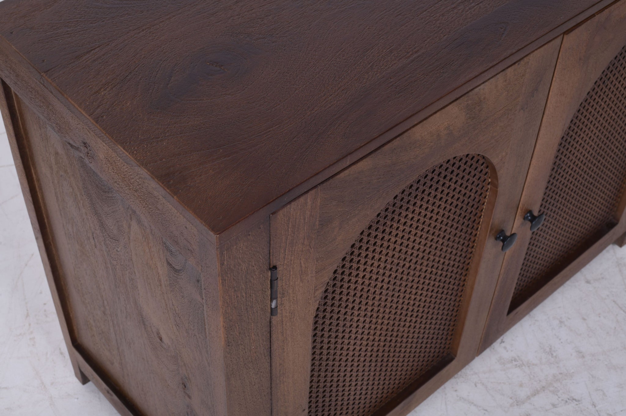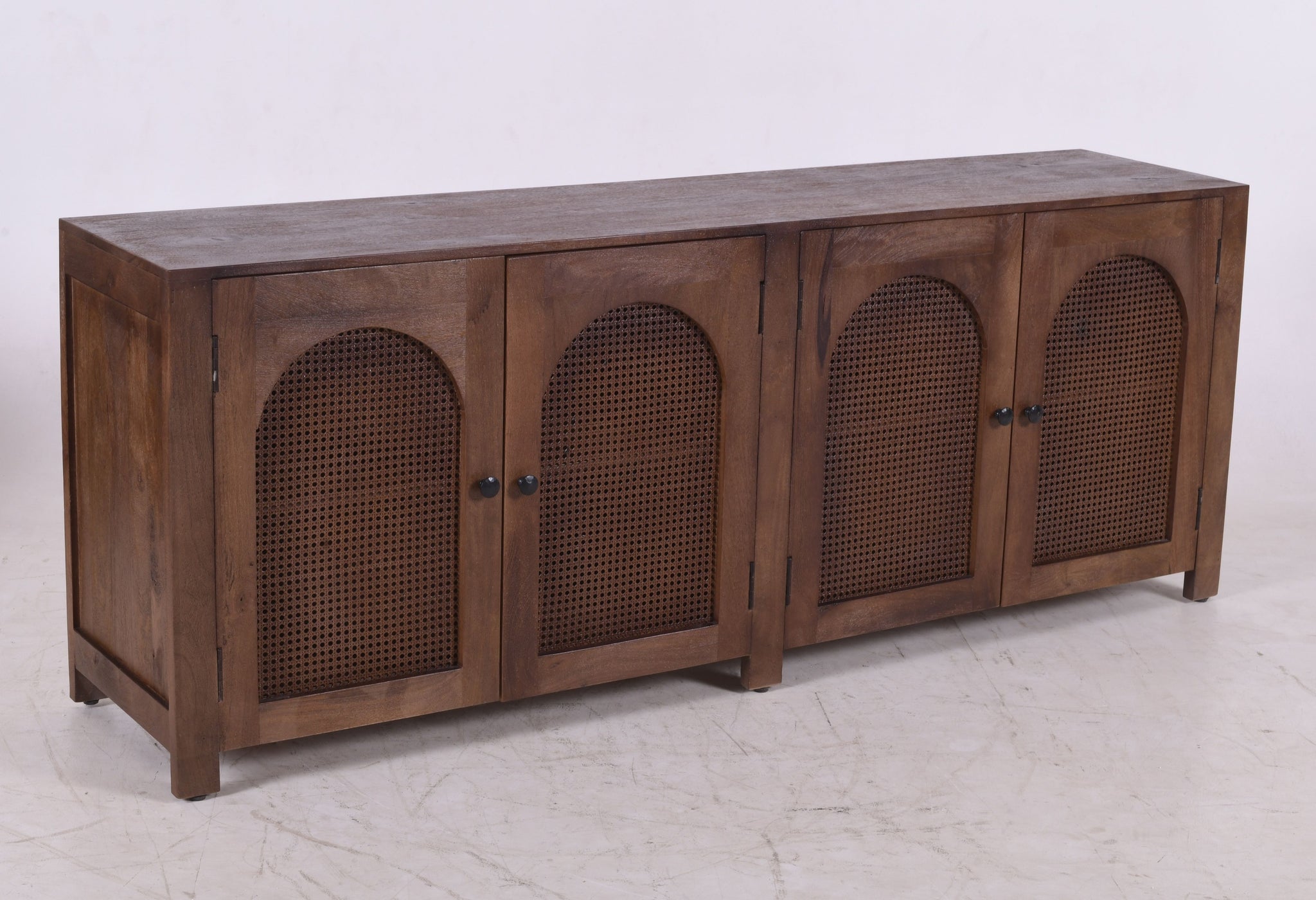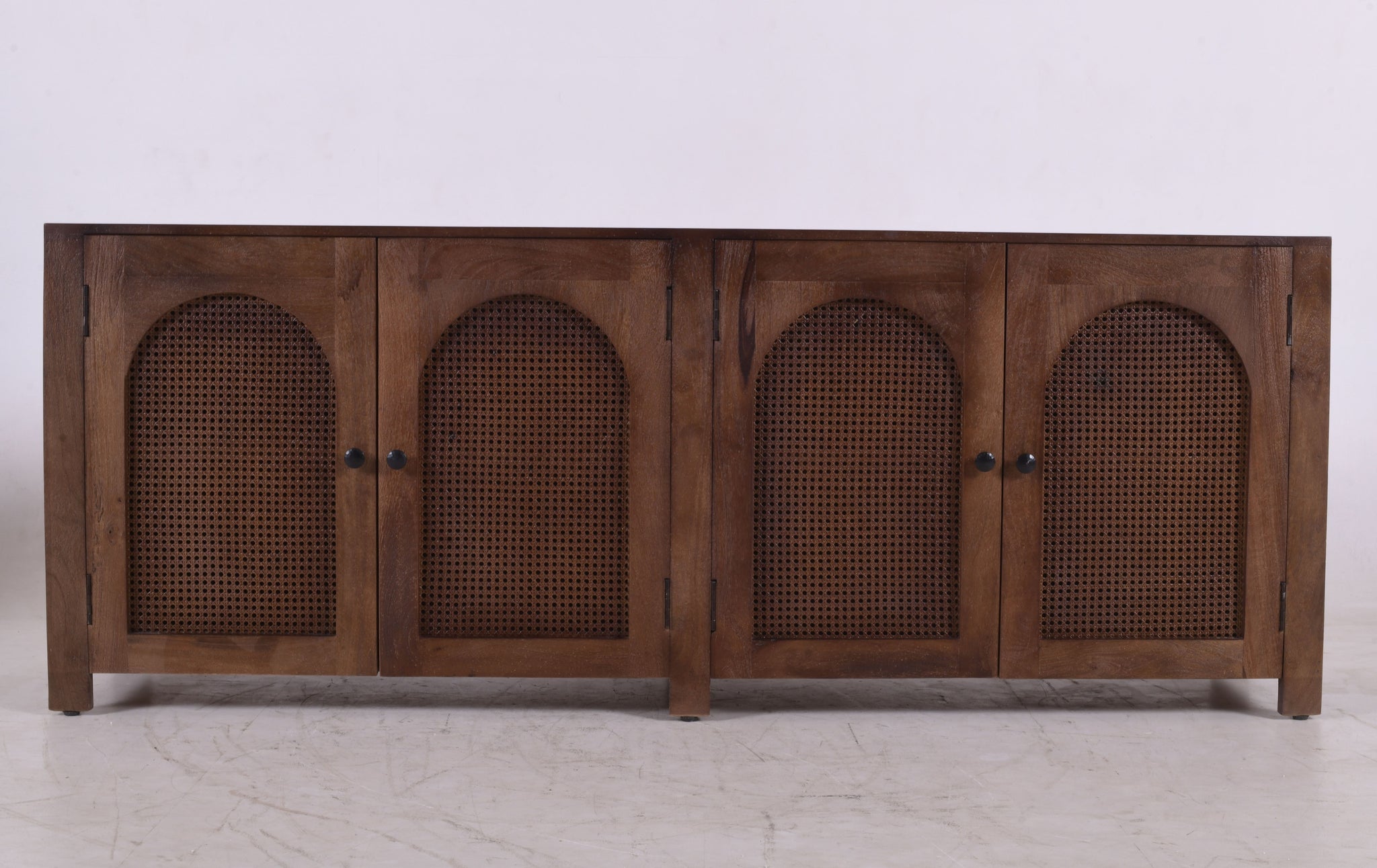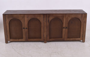 Woven Rattan Details: Inset within each arch are tightly woven natural rattan (cane) panels, providing a beautiful textural contrast to the dark wood.