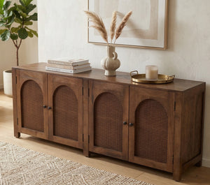 Transform your living space, dining room, or wide hallway with this magnificent 200cm Mango Wood & Rattan Sideboard. Blending mid-century modern silhouettes with relaxed bohemian textures, this expansive cabinet is designed to be a true focal point in your home.