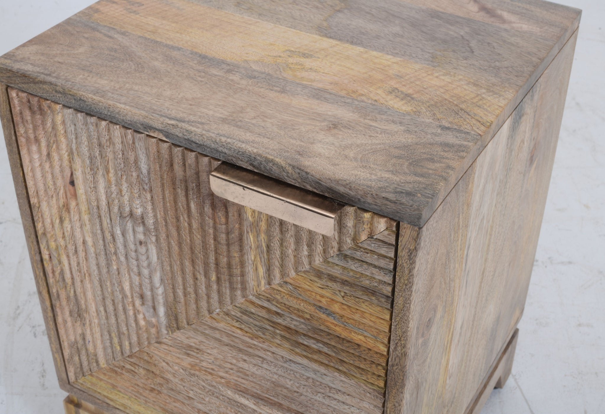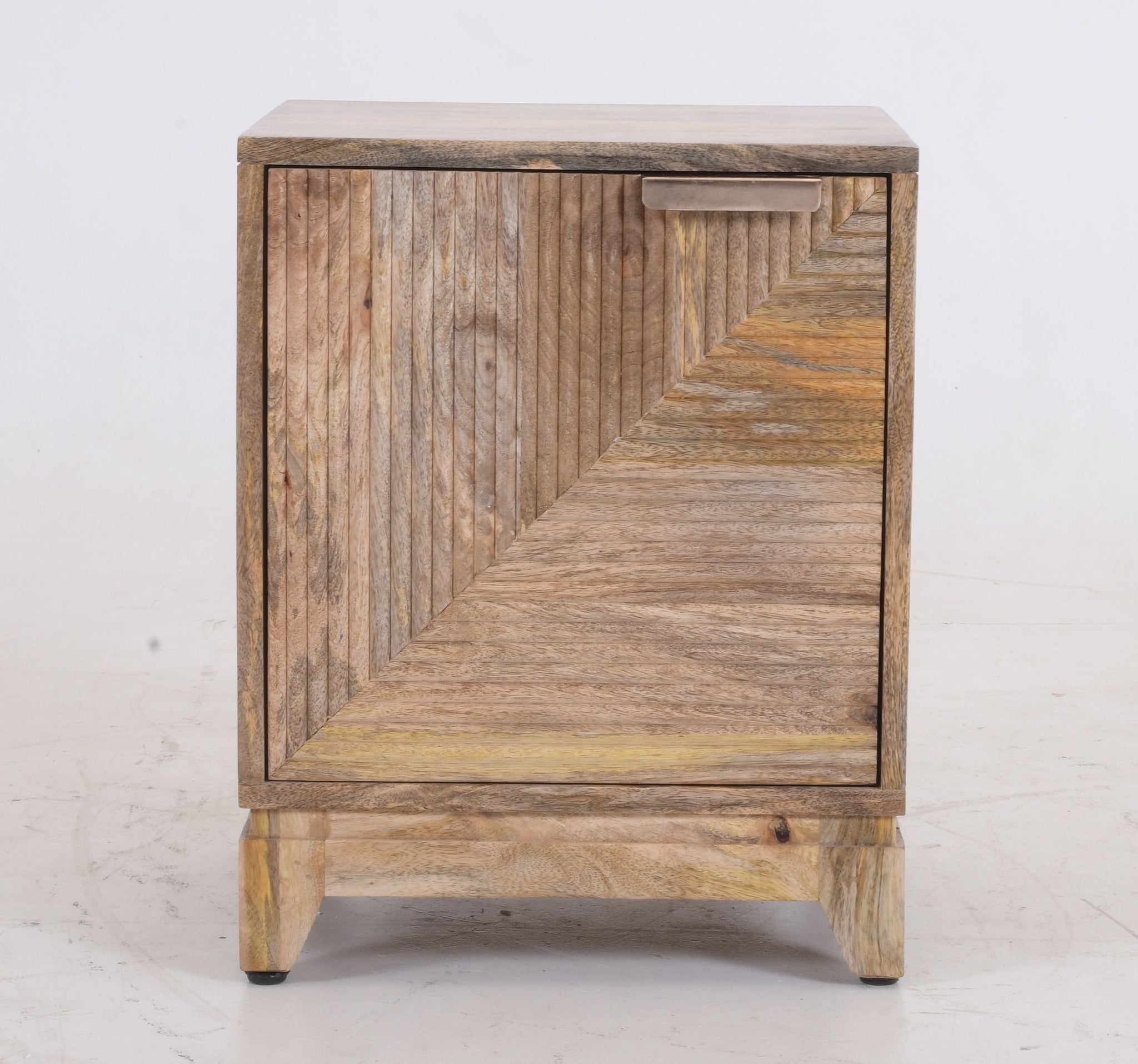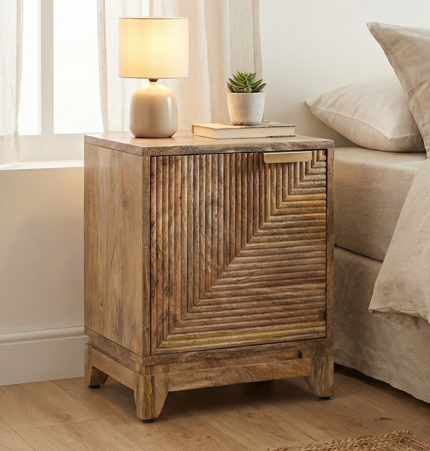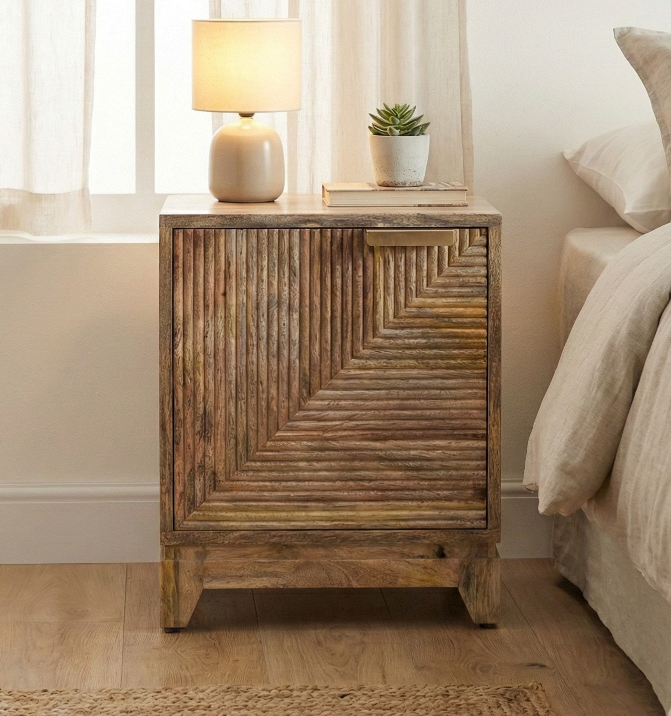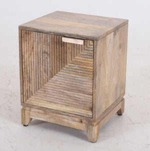 Hand-Carved Texture Crafted from 100% solid mango wood, the cabinet features a mesmerising 3D façade. The door is detailed with hand-carved, ribbed grooves arranged in a geometric, concentric square pattern that plays with light and shadow to add depth to your space.