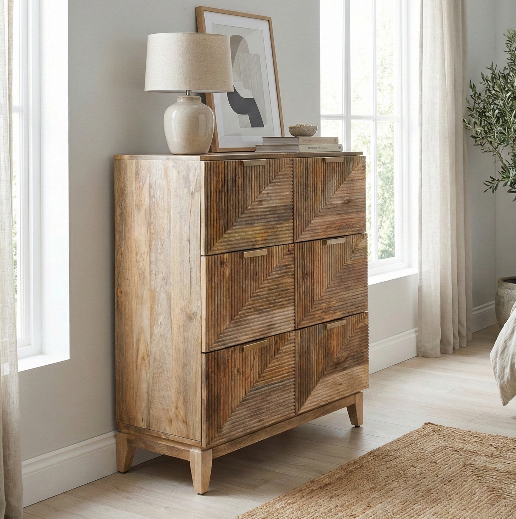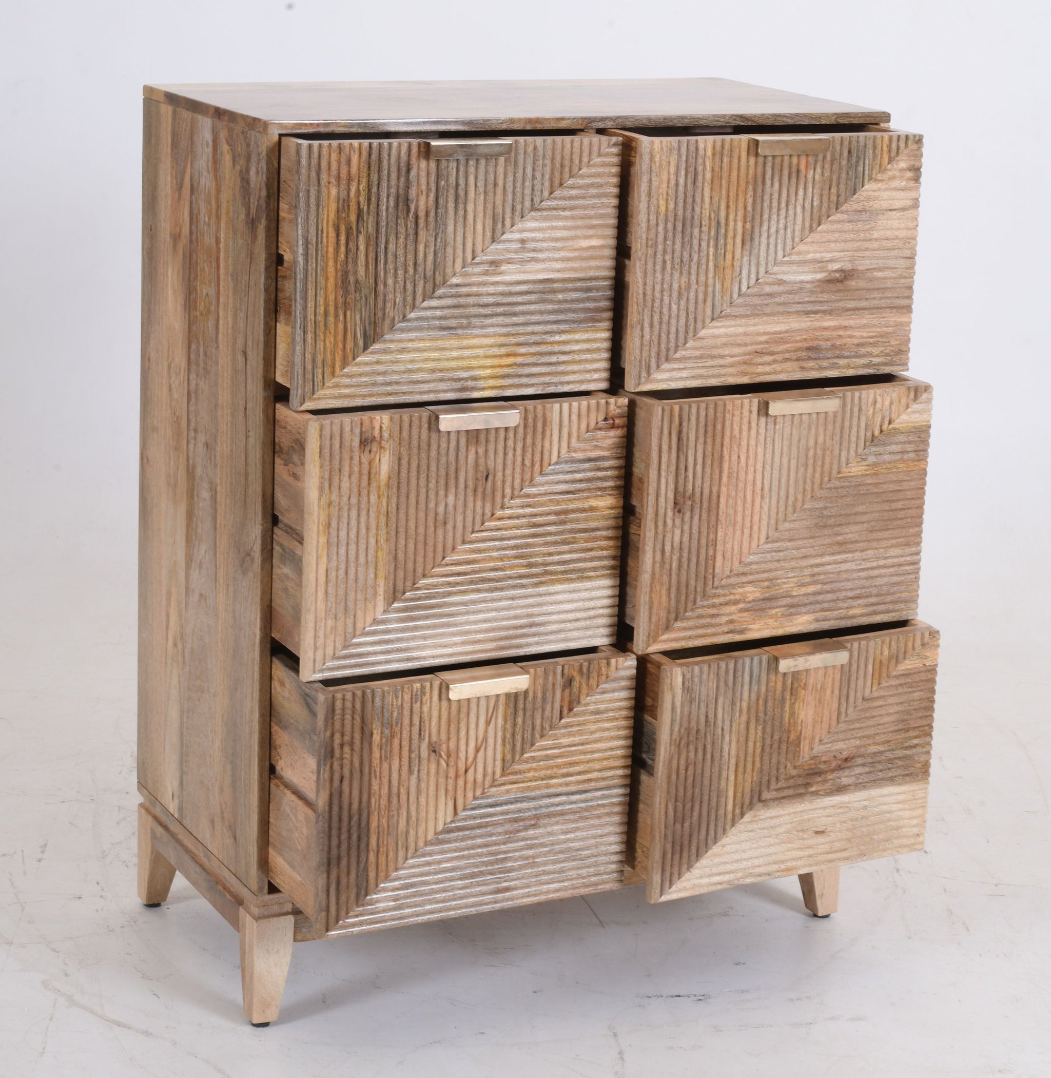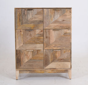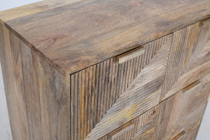Artisan Craftsmanship Constructed from 100% solid mango wood, this piece is defined by its intricate 3D façade. The drawer fronts feature a hand-carved, ribbed texture arranged in opposing diagonal lines, creating a dynamic geometric pattern that catches the light and adds depth to any room.
