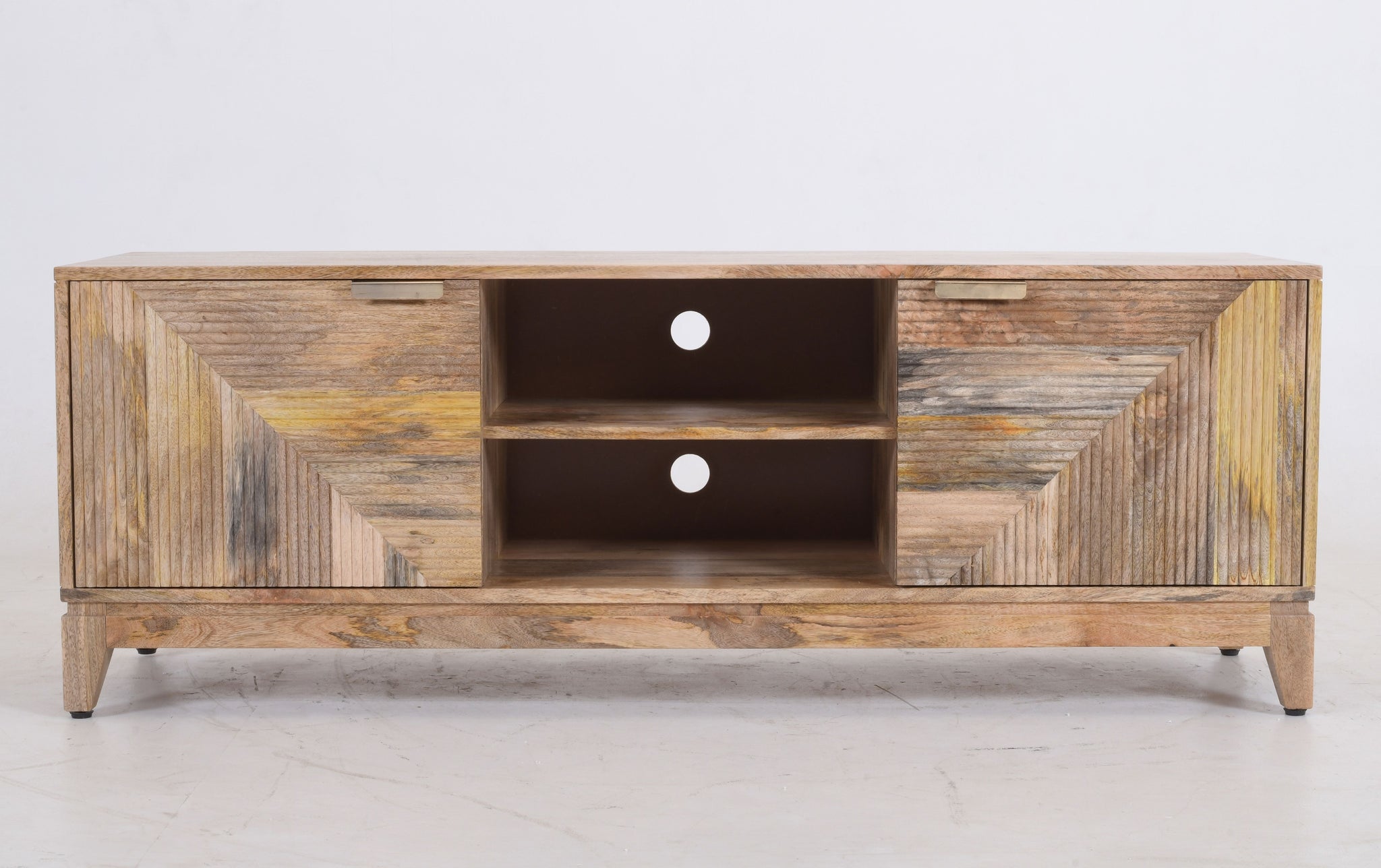 Crafted from 100% solid mango wood, the unit features a stunning hand-carved façade. The 3D ribbed detailing is arranged in a dynamic geometric pattern that catches the light, adding depth and character to your home.